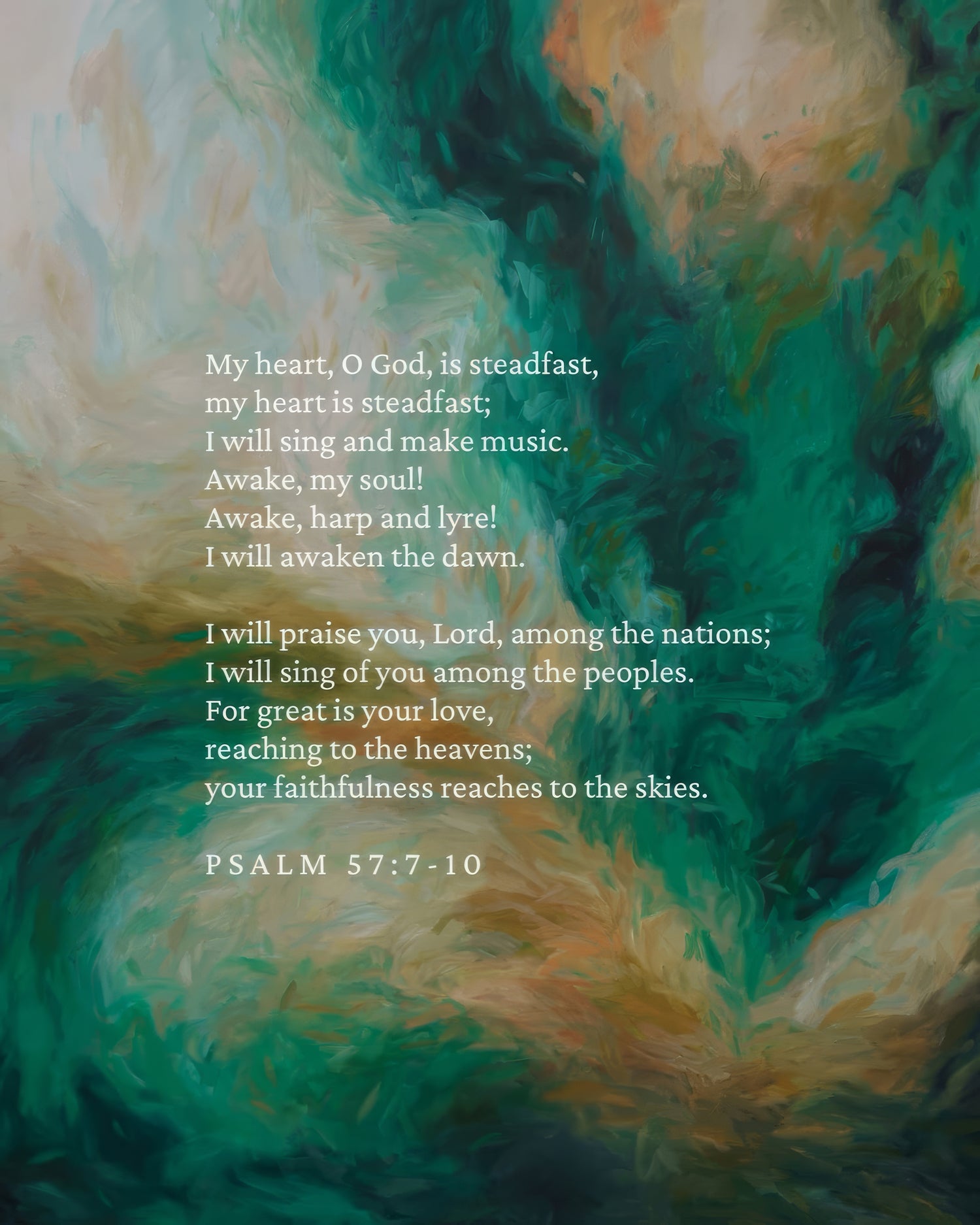 This piece is the title work for The Heart Song Collection. Inspired by Psalm 57, the weaving brushstrokes of this painting tell the stories of the songs within my heart that were once hush to a whisper, but now burst with an everlasting awakening in the symphony of the Great Orchestra the Lord has called me into. May my heart sing of His goodness for all my days – and oh, may yours sing, too.
