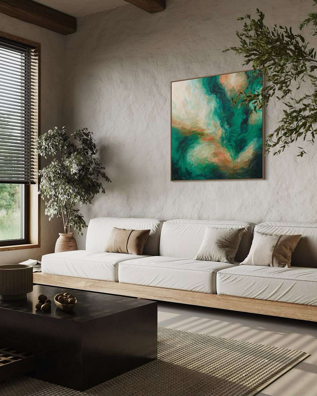 This will provide the most safety during travel, as well as the most affordable option for shipping. Once the painting is delivered, you can take it to a local framer to have it re-stretched. I can help you find a framer in your area, if desired! Once the piece is re-stretched, you can hang it as is OR have it framed — both ways work great.