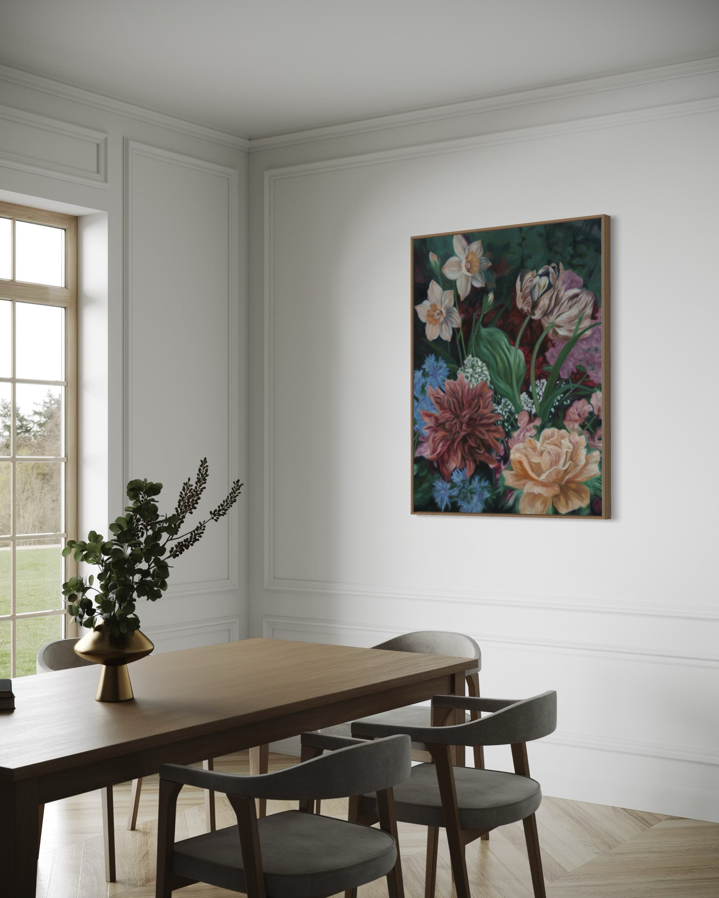 This will provide the most safety during travel, as well as the most affordable option for shipping. Once the painting is delivered, you can take it to a local framer to have it re-stretched. I can help you find a framer in your area, if desired! Once the piece is re-stretched, you can hang it as is OR have it framed — both ways work great.